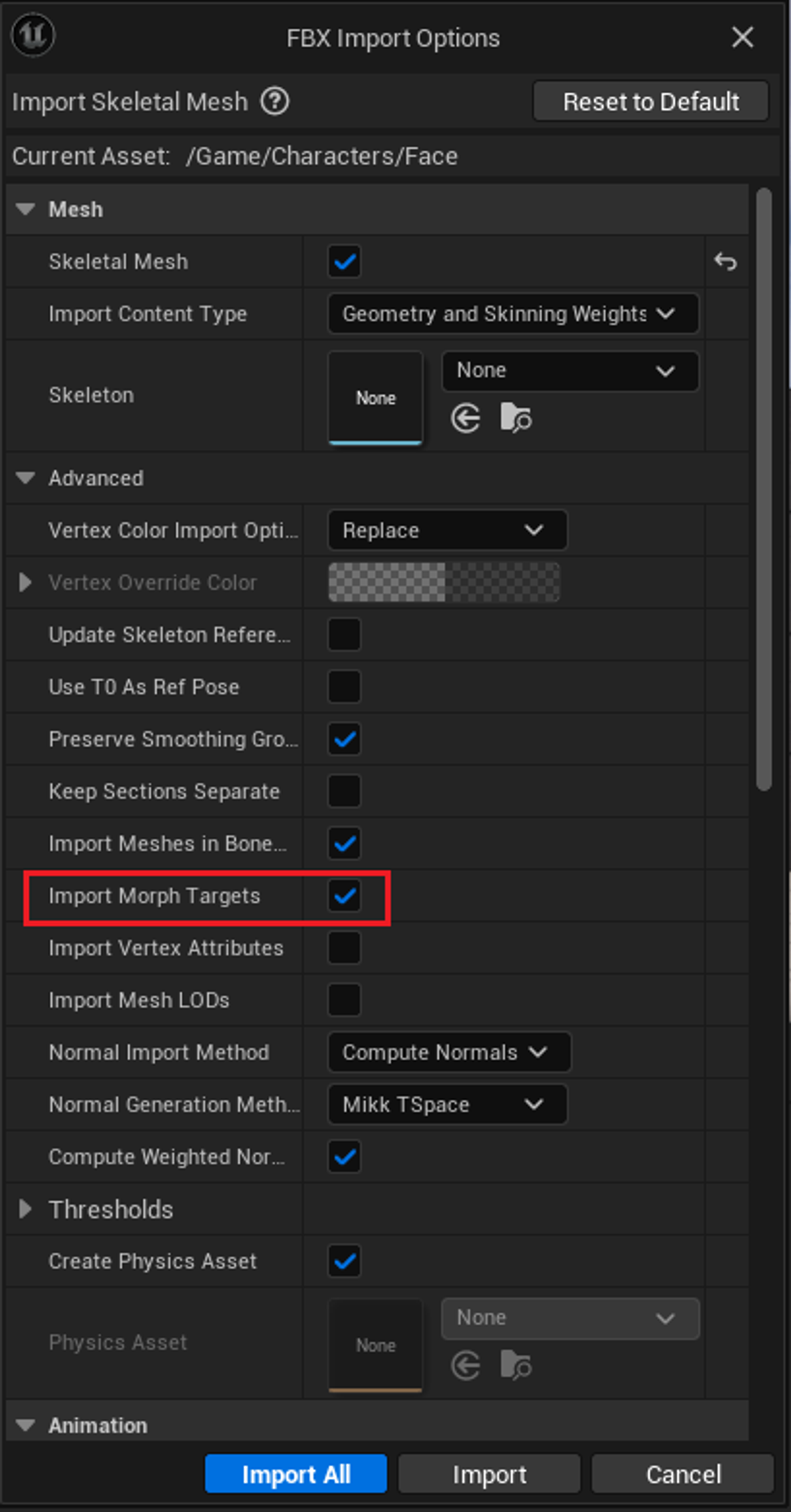 Import 시 고급 옵션 내 Import Morph Targets를 체크해준다.