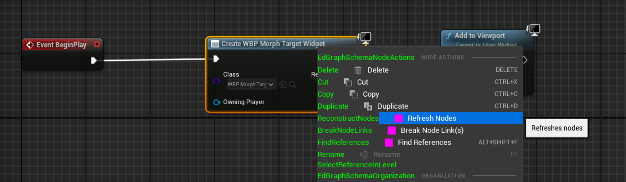 얼굴 액터 블루프린트에서 아래와 같은 로직을 넣고 Create Widget 노드를 선택한 후 Refrash Nodes를 선택한다.