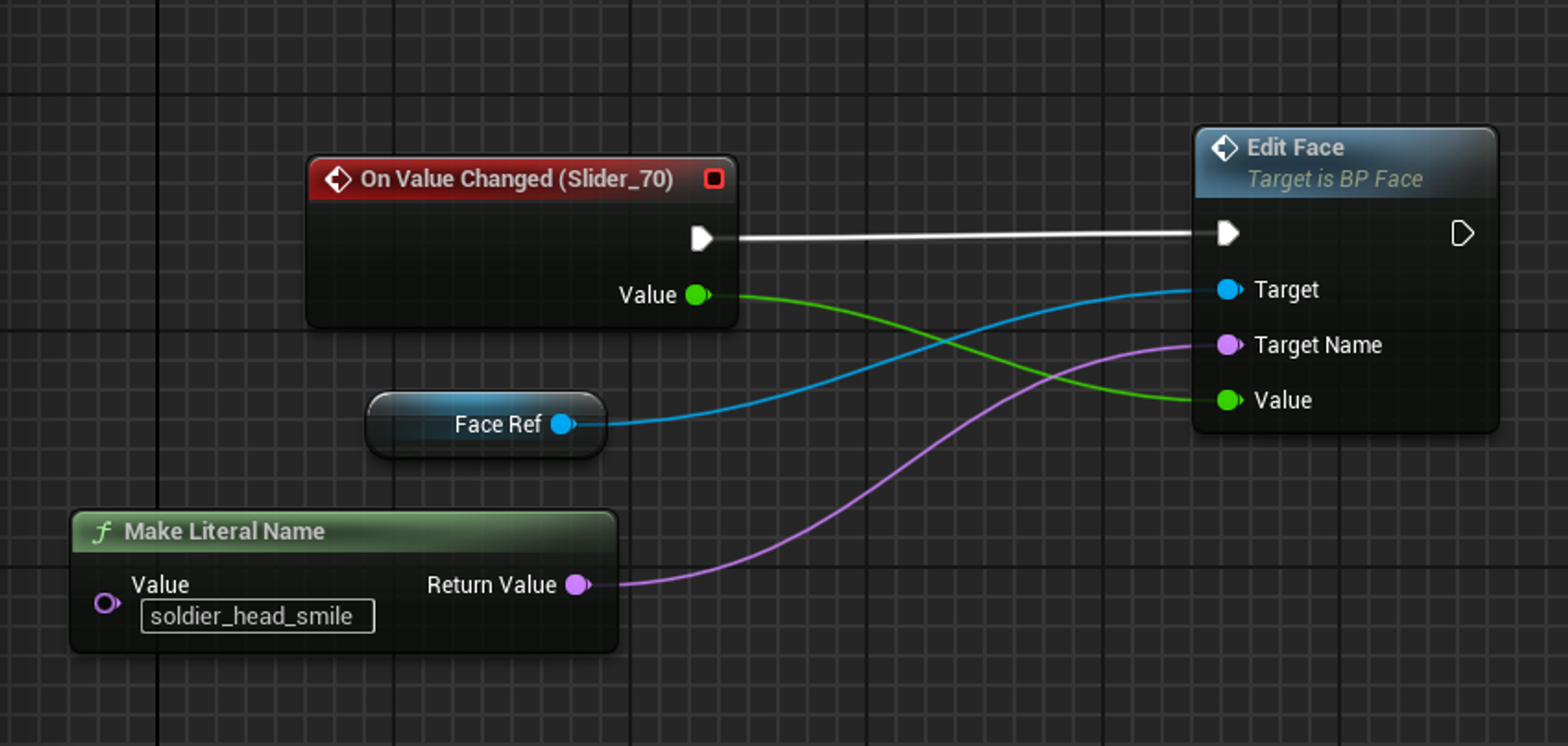 그리고 이벤트 그래프에서 슬라이더의 OnValueChanged 이벤트 호출 시 얼굴 액터의 커스텀 이벤트를 호출한다.