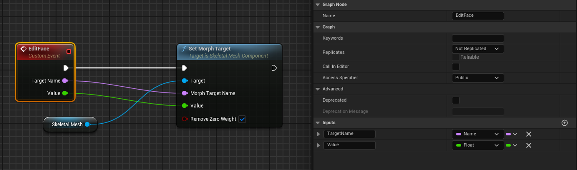 얼굴의 스켈레탈 메시를 하위로 둔 액터 블루프린트 클래스를 하나 만들어준다. 그리고 아래와 같은 커스텀 이벤트를 만든다.