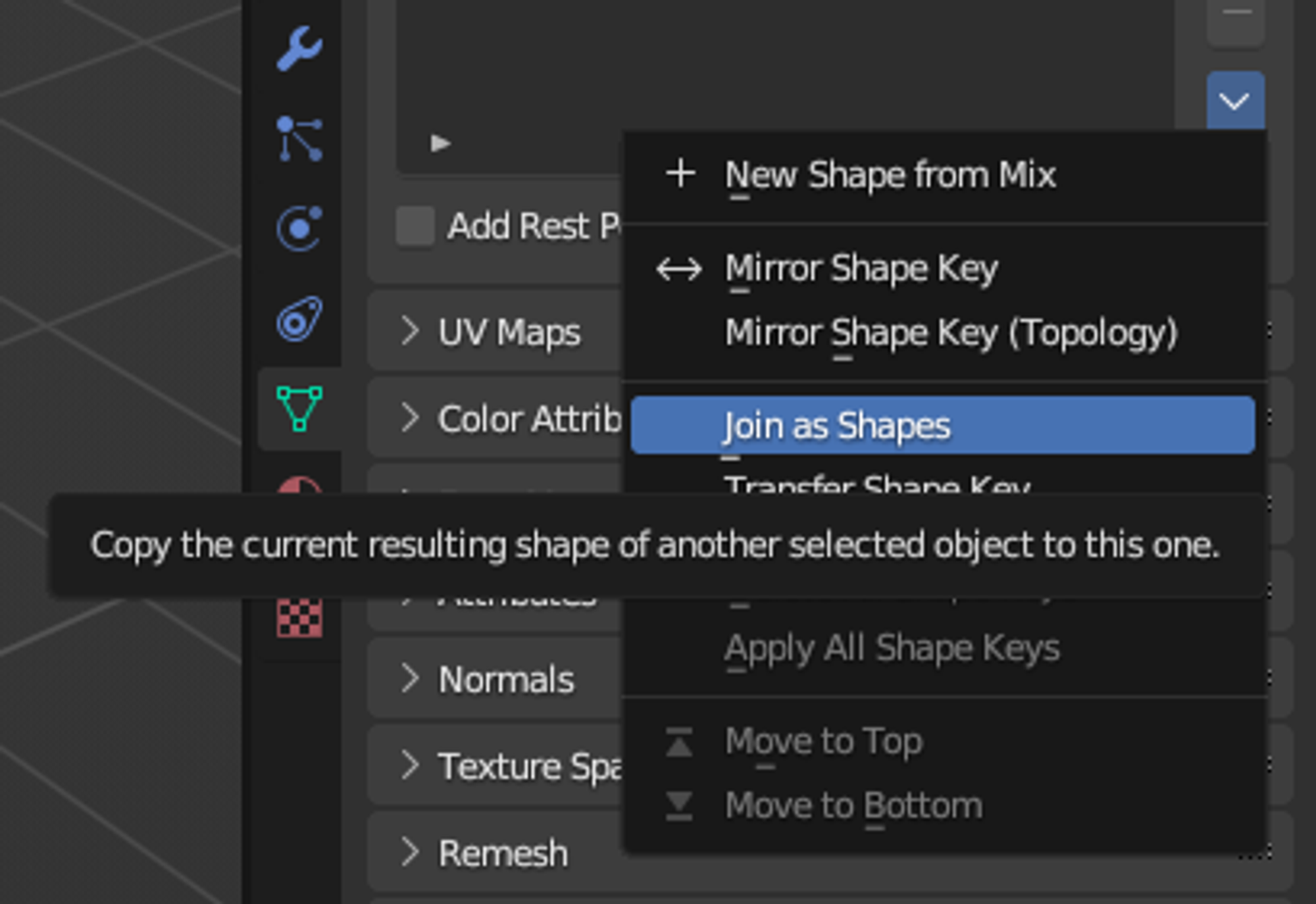 기본 표정을 제외한 다른 표정 메시 오브젝트들을 선택한 ▽ 버튼(Object Data Properties) 내 Join as Shapes를 선택한다.